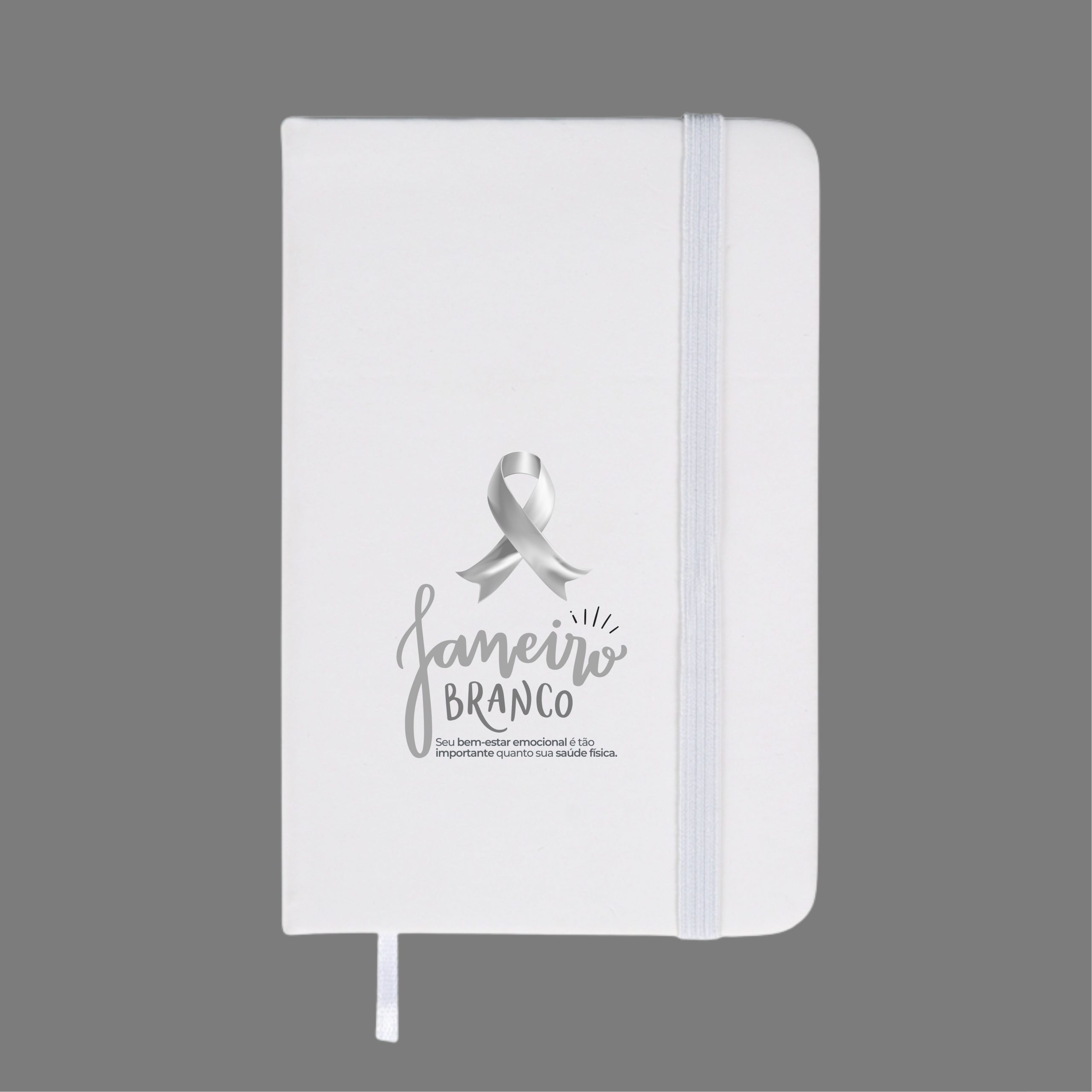 Descrição: Caderneta com capa emborrachada, marca-páginas em fita de cetim e fechamento em elástico. Possui aproximadamente 80 folhas pardas não pautadas.
