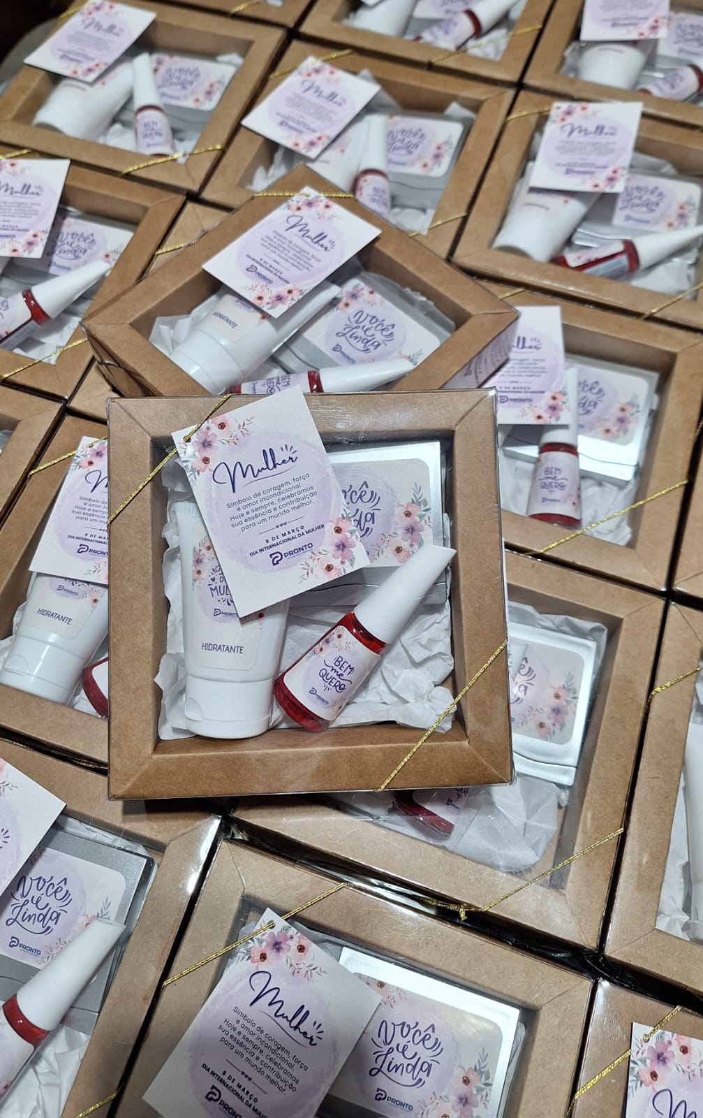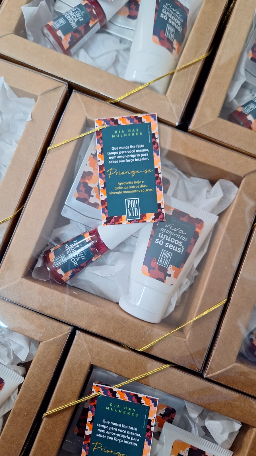 - acompanha caixa kraft com visor de acetato, fechamento com elástico + tag personalizada